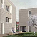 un basamento in cemento, il cui perimetro coincide con il rettangolo di base che contiene le principali funzioni pubbliche dell’intervento e al cui interno viene “scavato” il vuoto della piazza, e quattro blocchi in legno appoggiati sul basamento lungo l’asse longitudinale del rettangolo di base, che contengono le residenze per gli anziani e per le famiglie.